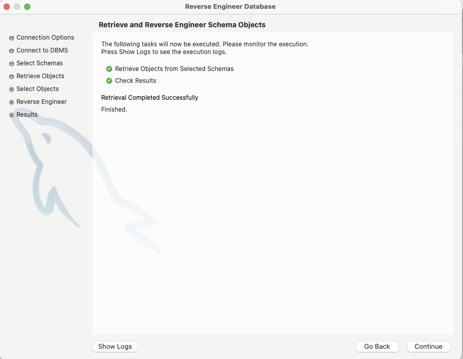 ERD 추출을 원하는 데이터베이스를 선택하고 Continue를 클릭한다.